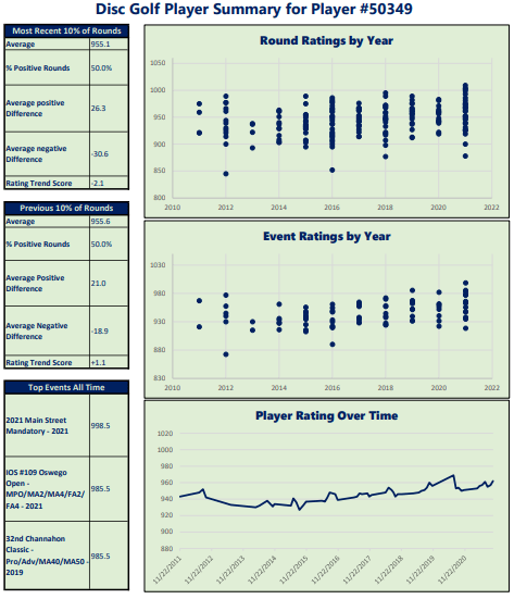 The Disc Golf Player Summary highlights trends from PDGA sanctioned tournament round performance (sanctioned leagues are not included). Specifically, it looks at how a player performs in a given round relative to their Player Rating at the time. When a player’s round rating is higher than their player rating at the time of the round, it is referred to as a positive round, and the difference between the round rating and the player’s rating at the time is called the positive round difference. For example, when a 950 rated player shoots a 980 rated round, the round is a positive round with a positive round difference of 30. Similarly, rounds below a player’s rating are considered negative rounds, with the difference between the player rating and round rating referred to as negative round difference. When a 950 player shoots a 920 rated round, this round is considered a negative round with negative round difference of -30. Here’s the information you’ll get out of the Player Summary: