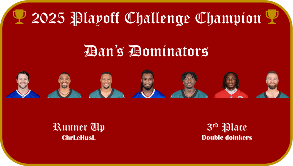 I will contact the first, second, and third place finishers individually and payouts will be distributed no later than Friday 2/14. Thank you to everyone for making 2025 our biggest Playoff Challenge yet!